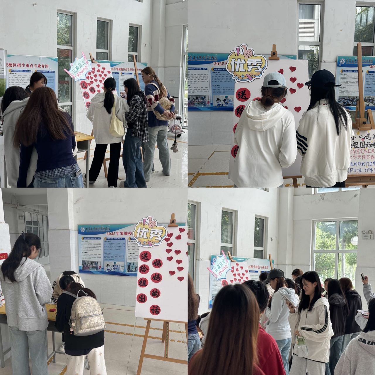活动当天,学生会成员提前在教学楼大厅布置完毕,背景板、心愿卡片等物料一应俱全。参与者在红色心形卡片上,不仅写下了对祖国的深情祝福和对未来发展的热切期盼,还记录了自身与祖国同呼吸、共成长的真切感悟。这些满载真挚情感的卡片,巧妙地构成了一面温暖醒目的“爱心祝福墙”。过往师生纷纷驻足参观,在轻声诵读与相互交流中,赤诚的爱国情怀在校园里悄然传递。